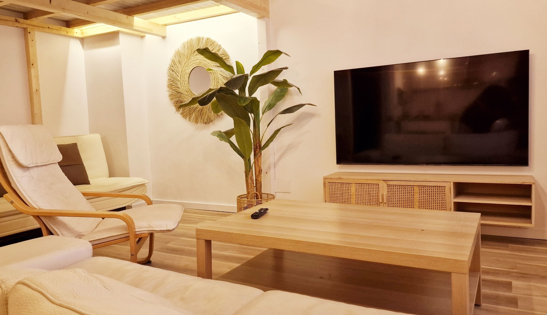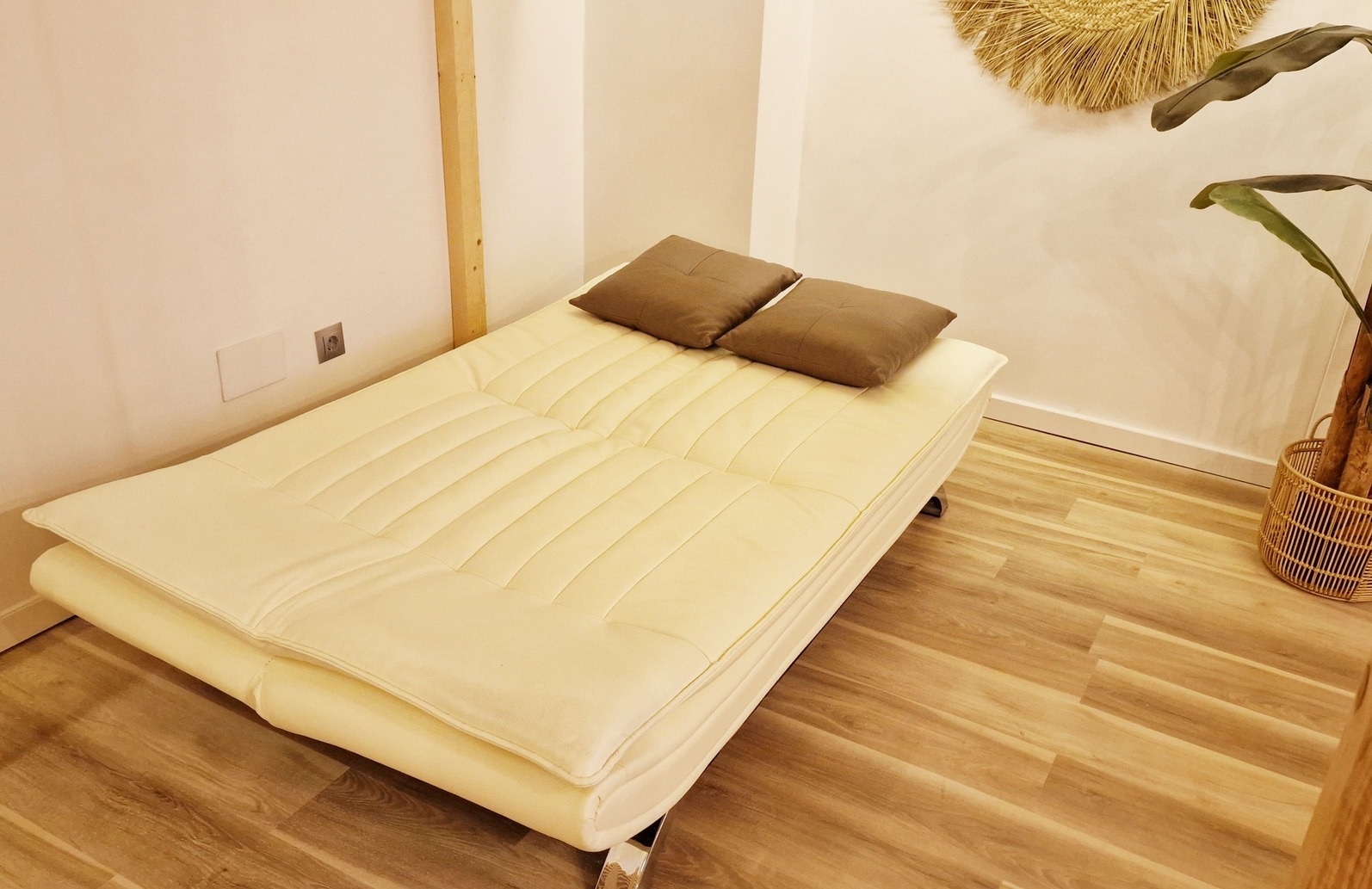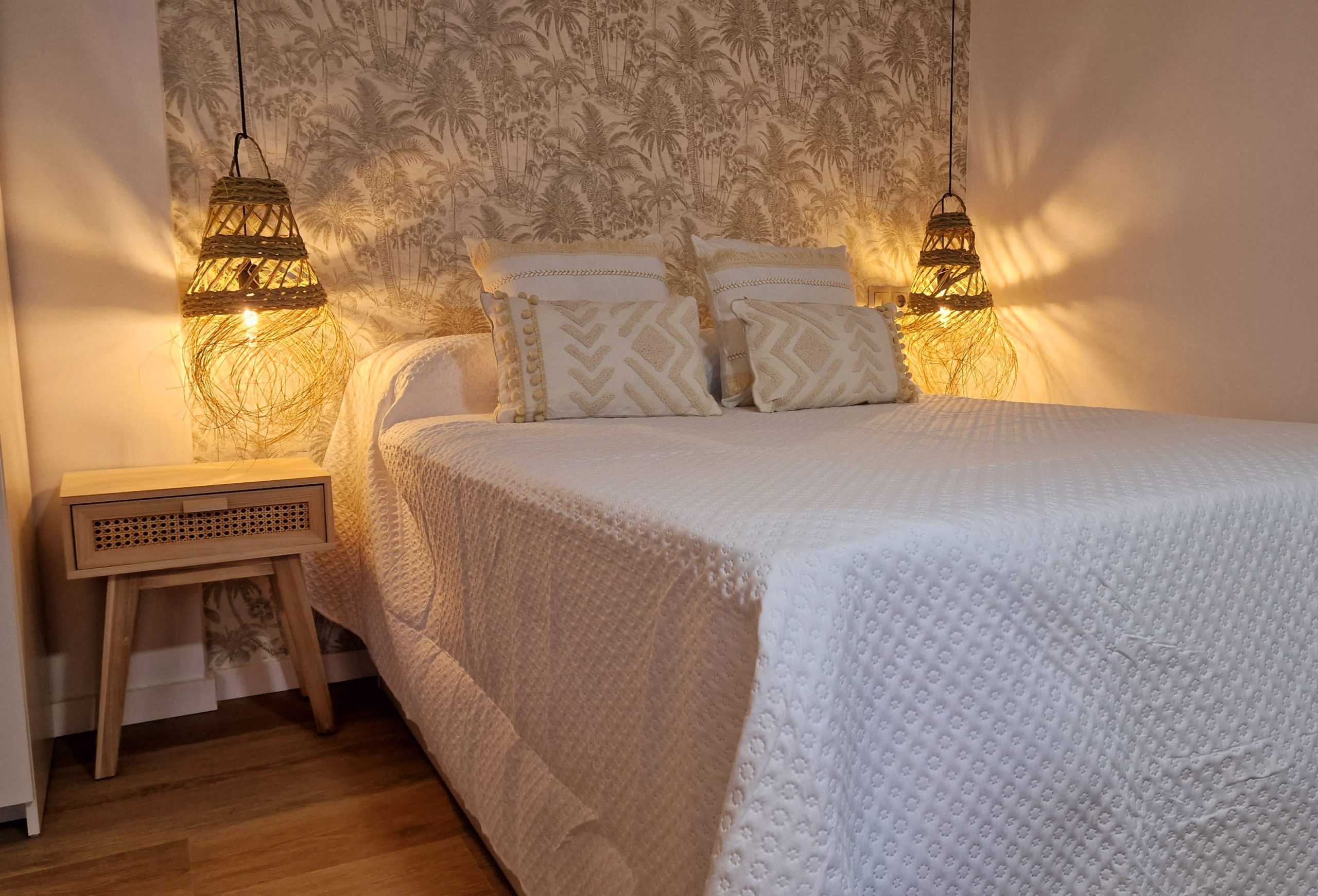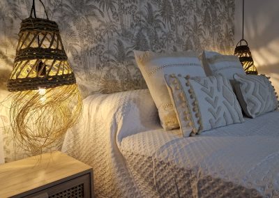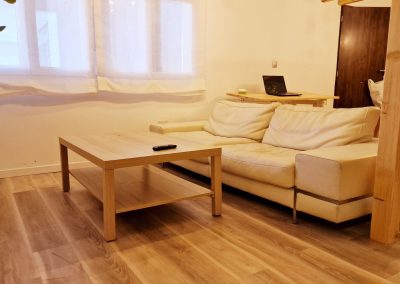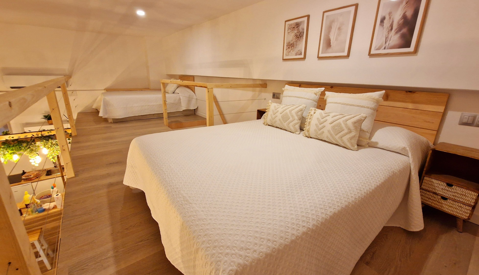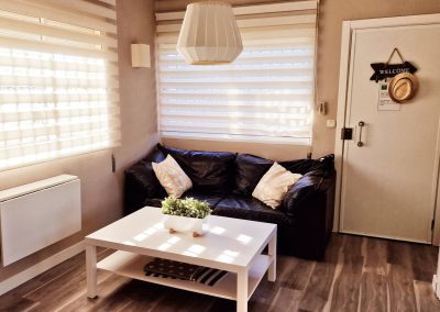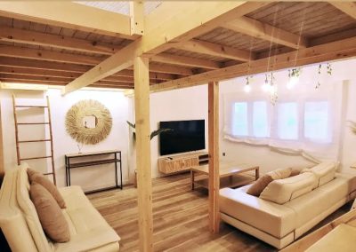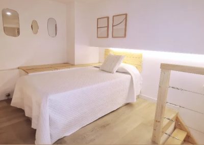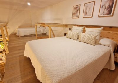 Consta en la planta alta de una cama doble de 150cm y una individual amplia de 105 cm además de un sofá cama de polipiel, apto para otras 2 personas (125cm), pero tengan en cuenta que la comodidad del sofá cama no es comparable a una cama y lo recomendamos solo para niños o para estancias cortas. Si alguno mide más de 195cm, algunas zonas le pueden resultar incómodas.