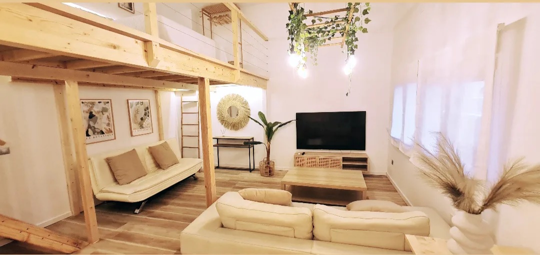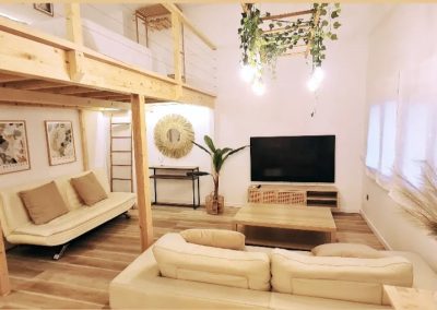 Estiloso y amplio loft en pleno centro de Torremolinos a pocos metros de bares y restaurantes y muy cerca de la playa. Con 60 metros cuadrados útiles tendrás un baño espectacular, una cocina super amplia, una zona de estar, una planta alta panorámica y una terraza con césped artificial donde descansar, charlar un rato, desayunar o fumar, mientras te tomas algo.